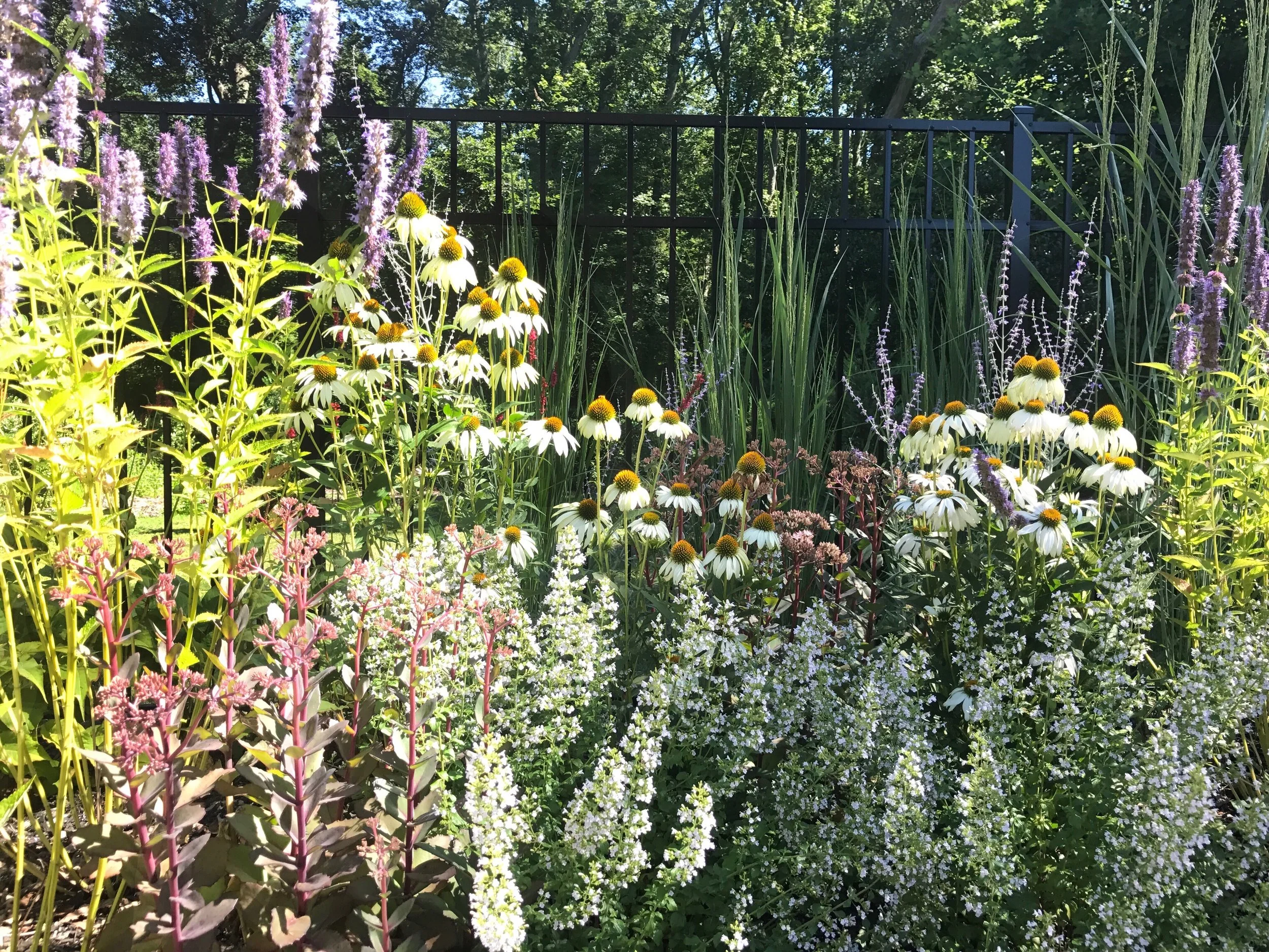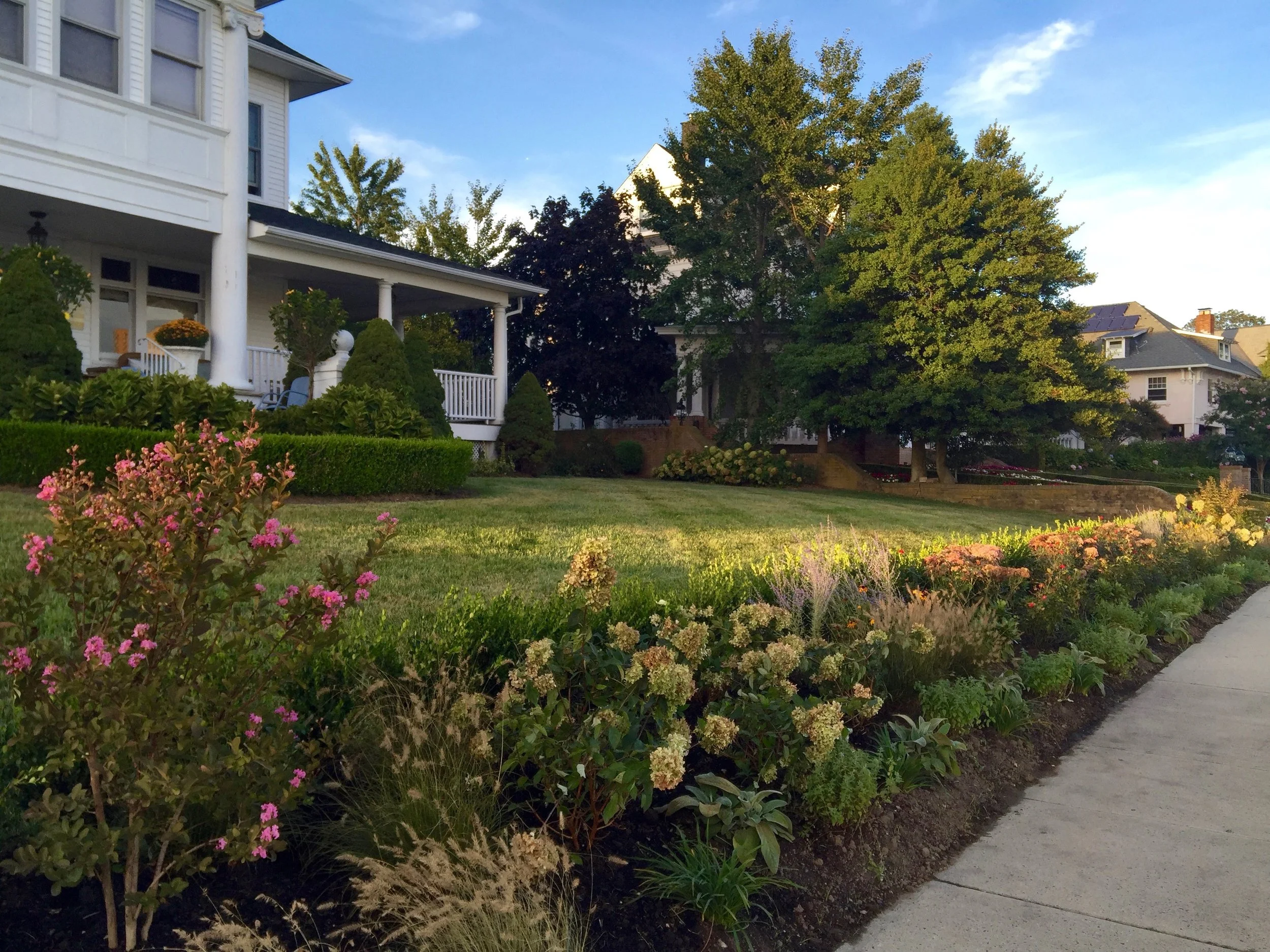 Overlooking a seaside lake, this wide front garden presented as many challenges as it did opportunities. Ryan added an element of wildness while maintaining continuity with the formal design of the existing landscape. Ryan removed much of the front lawn to create large borders along the front sidewalk and driveway. The major concerns were strong winds off of the lake and Canada geese in the winter. By backing the front border with a long, low boxwood hedge, and including many small structural shrubs and perennials, Ryan effectively created a formal garden framework that provided a barrier from geese and could withstand damaging winds. This was balanced by a naturalistic palette of grasses, asters, and other prairie plants; adding a sense whimsicality and attracting birds and other pollinators.