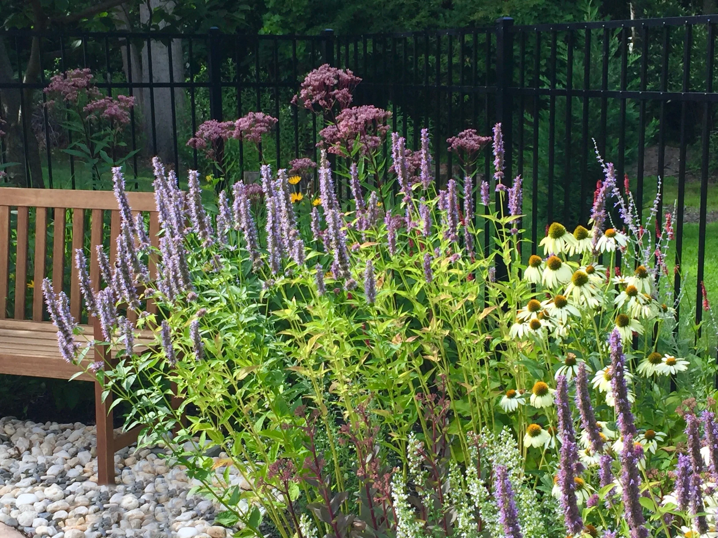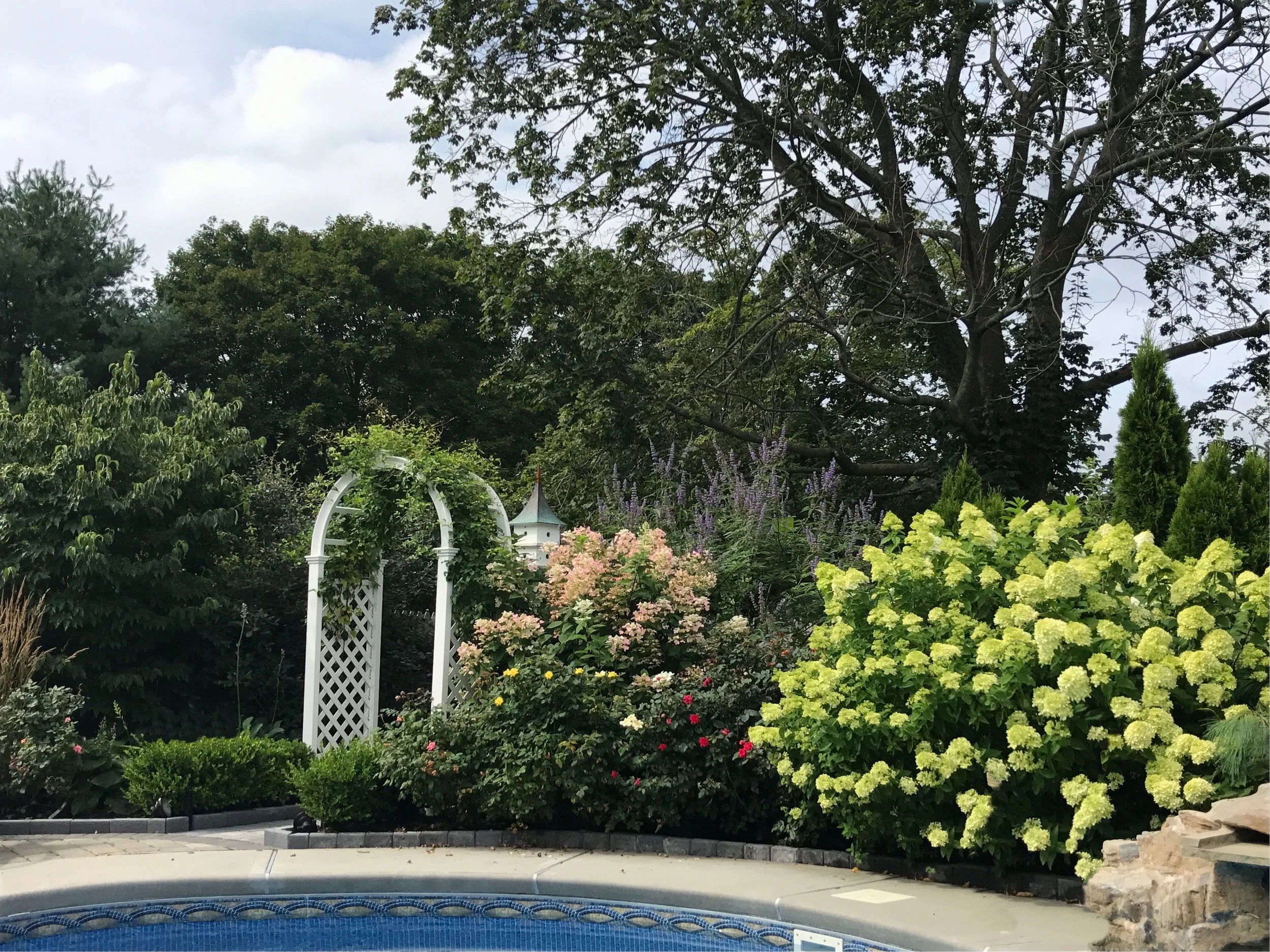 The clients wanted a low-maintenance poolside garden with all-season color at their summer home in a sandy loam with large pockets of clay.